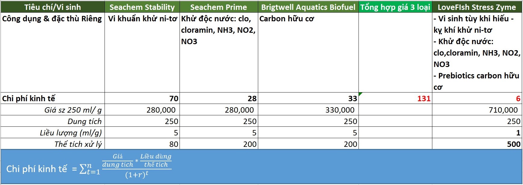 LoveFish Stress Zyme có chi phí kinh tế thấp nhất thị trường và chất lượng vượt trội hơn các sản phẩm cạnh tranh. Vì LoveFish Stress Zyme bao gồm 3 thành phần: Vi sinh, Chất khử độc, Prebiotics carbon hữu cơ, chi phí so sánh bảng sau đây cho thấy tính kinh tế của LoveFish Stress Zyme là thấp nhất chỉ có 6đ cho 1 lần xử lý so với 131đ khi sử dụng tổ hợp cả 3 sản phẩm tương đương. LoveFish Stress Zyme rẻ hơn gấp 24 lần (131/11=24 lần). Vì vậy LoveFish Stress Zyme là sản phẩm chất lượng cao và rẻ nhất thị trường.